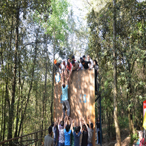 逃生墙是由光滑木板制成的高4米的木墙,团队中所有人在不借助任何工具的情况下翻上这堵墙,即为逃生成功。一旦这堵墙光靠一个人,两个人的力量是绝对不可能完成的,你更需要的是队友们的帮助和协助。